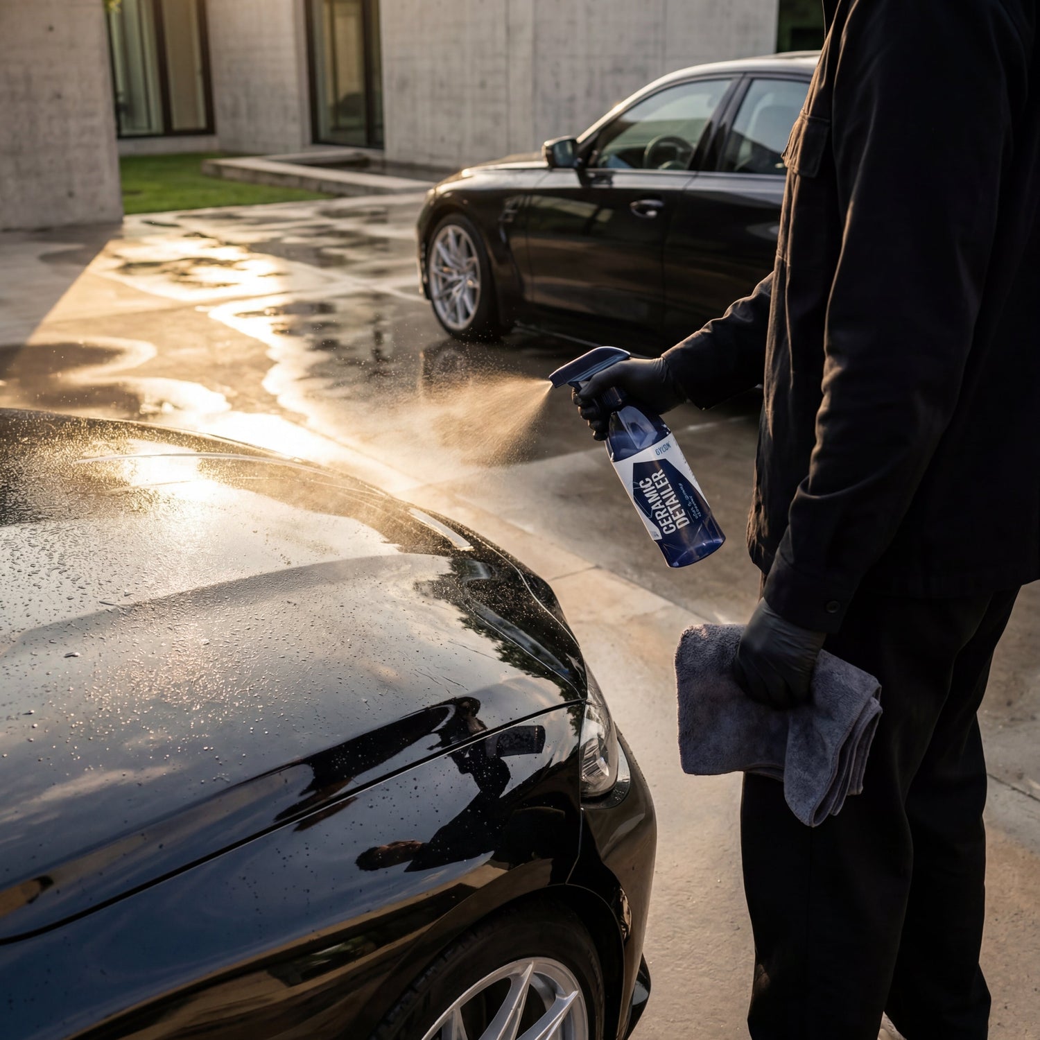On wet paint immediately after washing: 2–3 sprays per panel onto the wet surface, then wipe off with a drying towel in straight passes. CeramicDetailer acts as a drying aid here — the water is absorbed by the towel rather than smeared, and the SiO₂ protective layer builds up in the same step. This method saves a good 10 minutes during the weekend wash compared to separate drying and subsequent sealing.