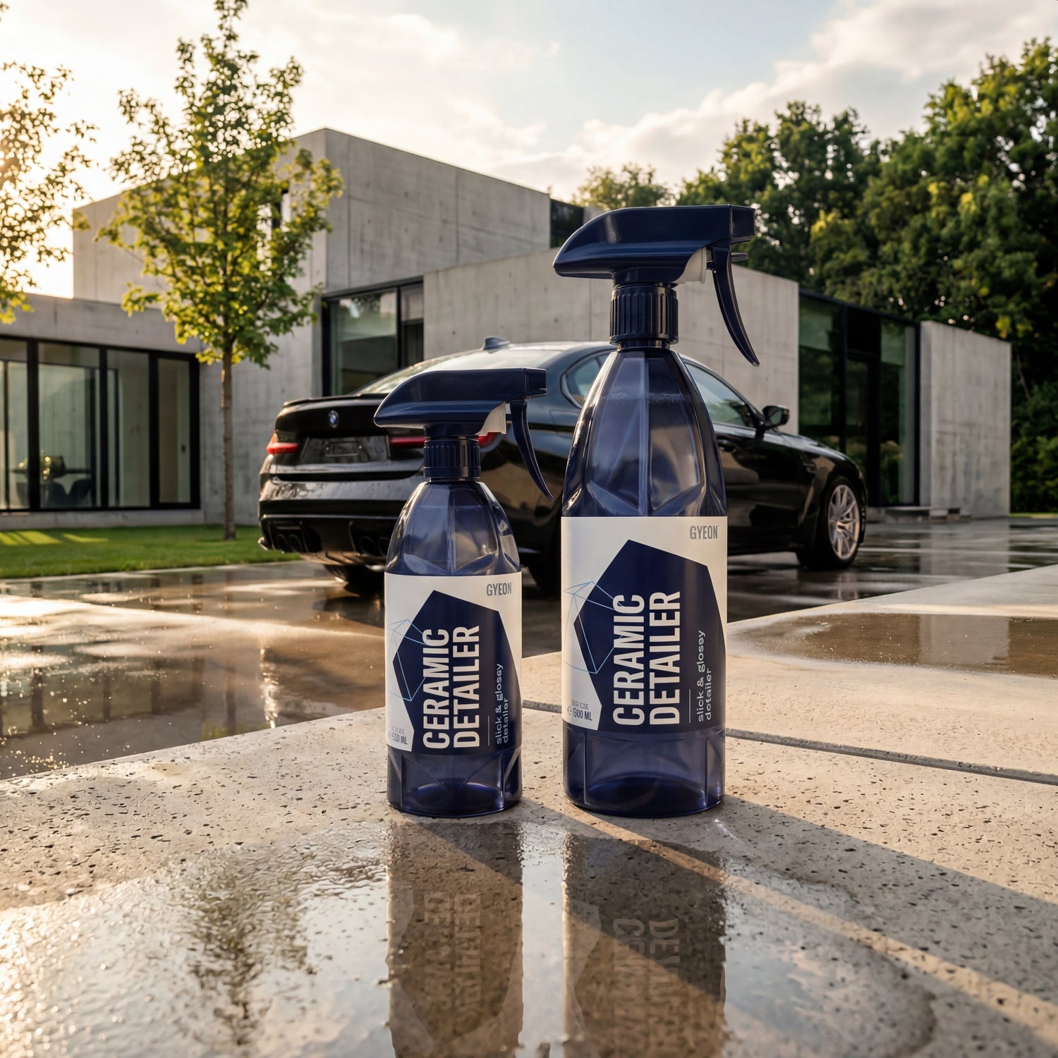 The CeramicDetailer is an SiO₂-based quick detailer from GYEON, specially developed for the care of ceramic-coated vehicles. The SiO₂ particles chemically bond to existing ceramic coatings, building a temporary protective layer that refreshes hydrophobicity, gloss, and dirt repellency for 4–6 weeks.