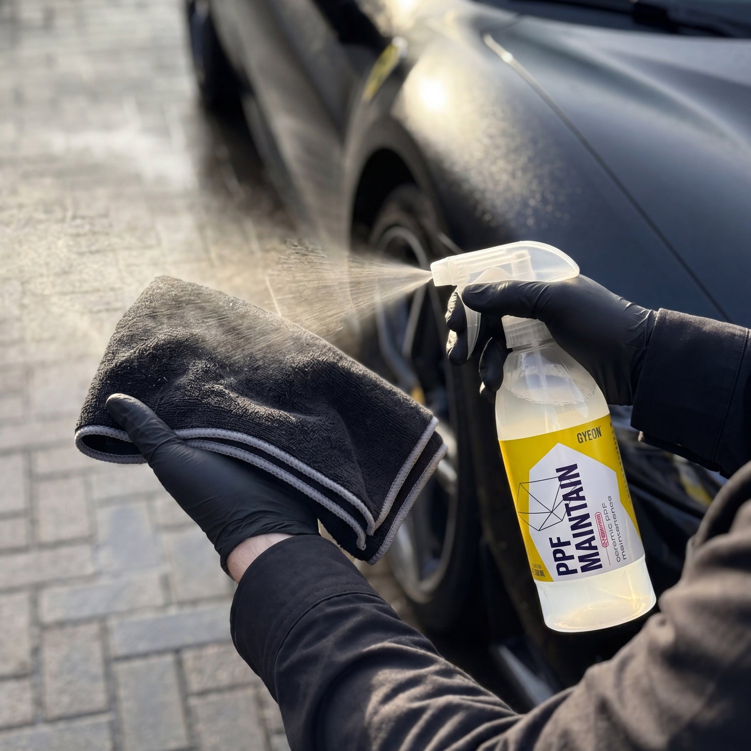 GYEON Q²M PPF Maintain is a spray sealant from GYEON's REDEFINED series, formulated for polyurethane and thermoplastic polyurethane films. The SiO² content of over 5 percent builds a silicate layer on the film, maintaining the contact angle above 80° and preventing organic contaminants from adhering. The pH range between 4 and 9 makes the sealant compatible with common coatings — unlike quick detailers for paint, which contain solvents or silicone oils and can attack plasticizers in the film material.