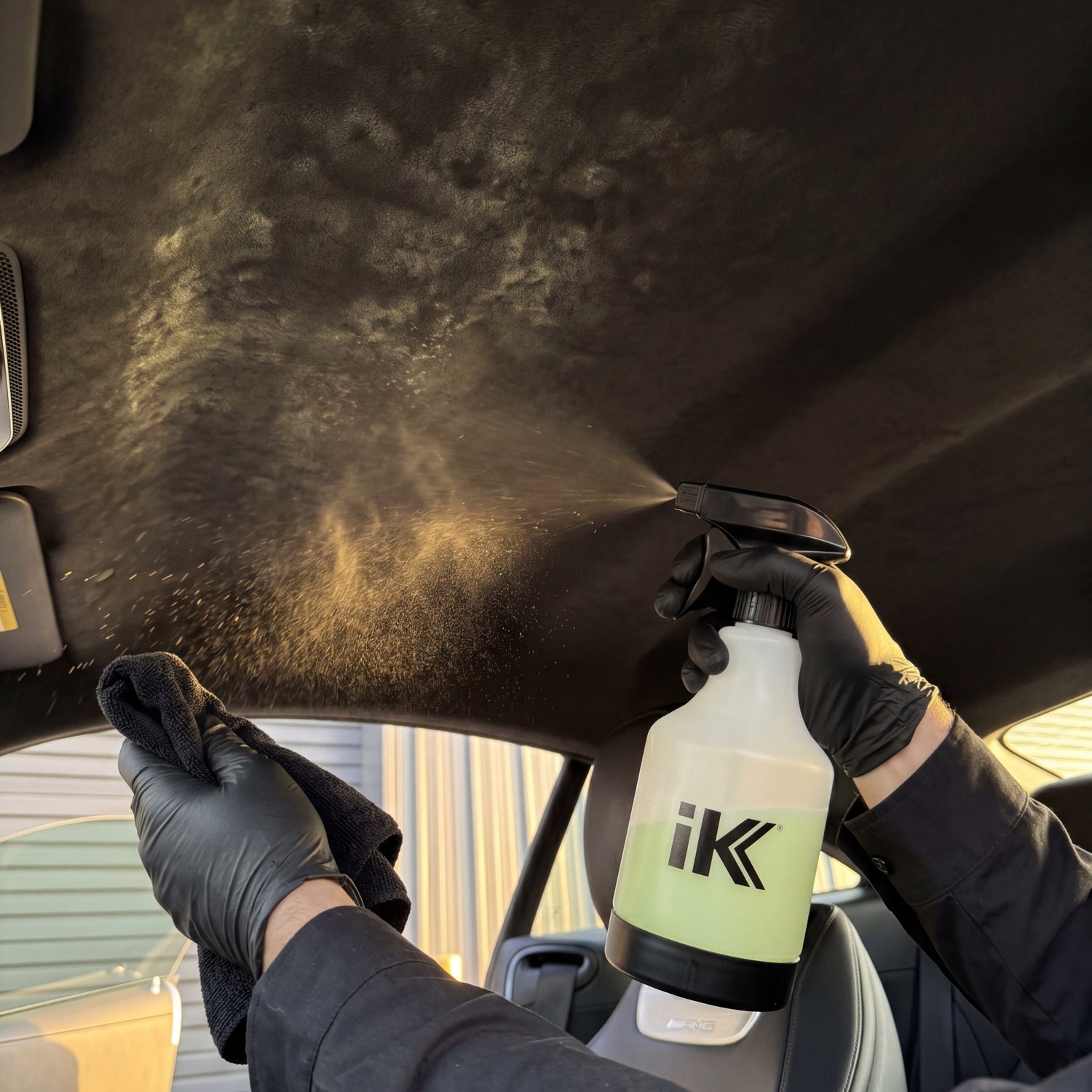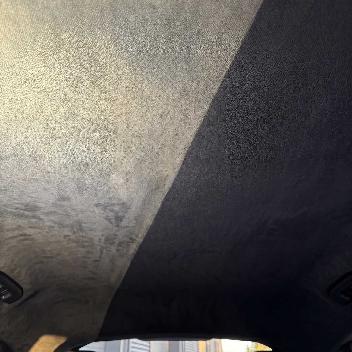 For headliners, apply sparingly and never soak. The textile over the adhesive cannot tolerate standing moisture. Spray, brush briefly, and vacuum immediately. One pass is sufficient for slight discoloration. For nicotine deposits, it's better to do two passes rather than use a higher concentration – this protects the material and results in a more even finish.