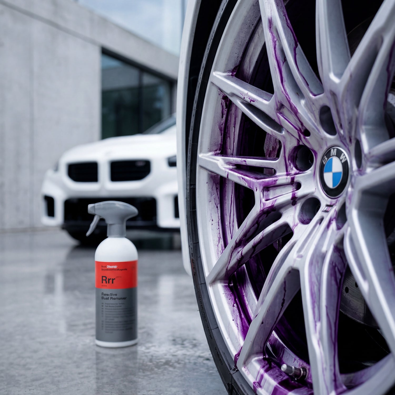 Rrr is pH-neutral (pH 7.5) and safe for all surfaces — paint, glass, polished aluminum, chrome. The Reactive Wheel Cleaner is acidic and removes heavier brake dust, but should not be used on sensitive rim surfaces such as polished or anodized aluminum.