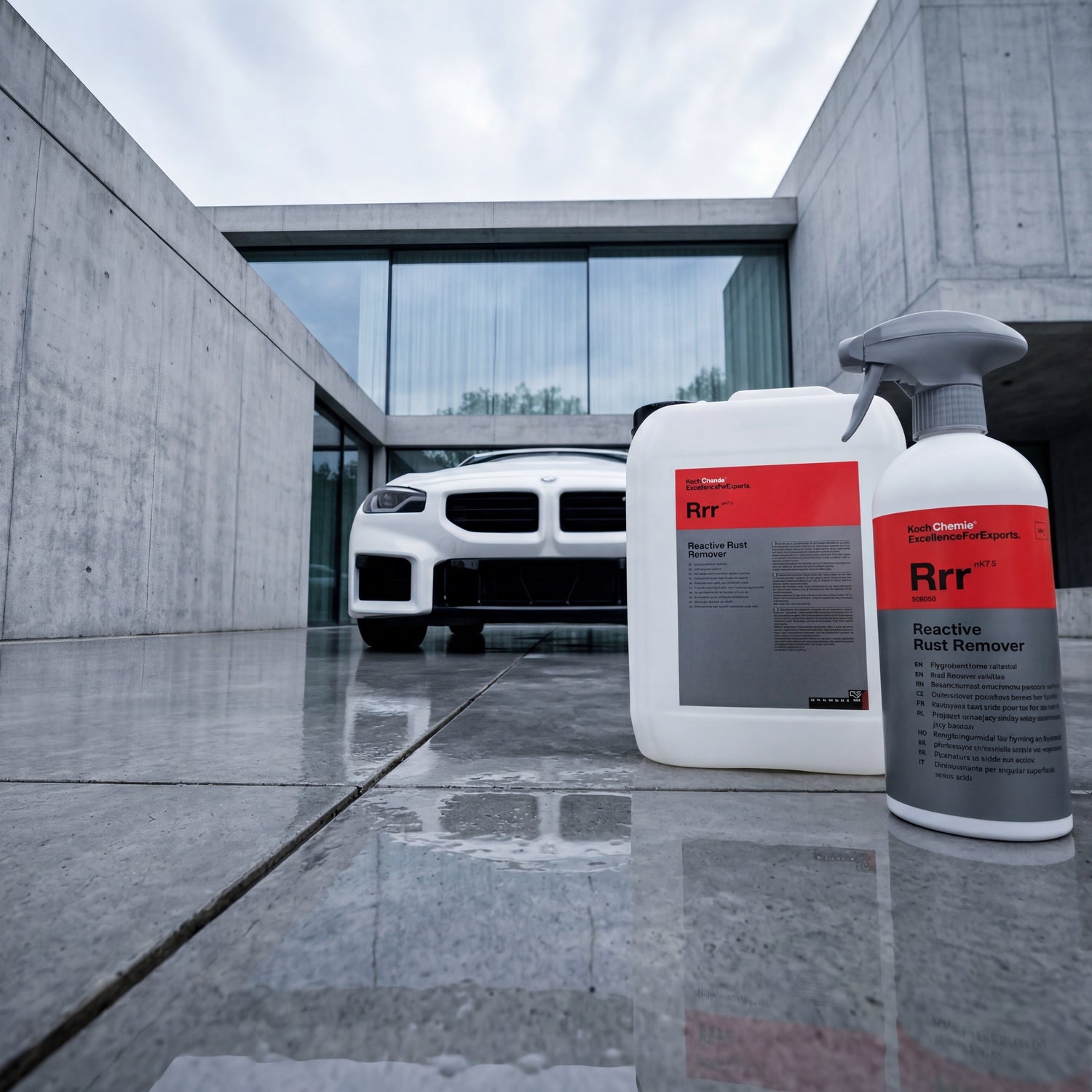 As a complete solution, you use the Rrr before the car shampoo: first chemically dissolve surface rust, then the normal wash. This is the most efficient workflow because the Rrr adheres and works best on a dry surface. If your vehicle has a ceramic coating, you can use the Rrr without hesitation — pH 7.5 does not attack any coating. On the contrary: surface rust under a coating is the bigger problem because it settles there and undermines the coating from below.