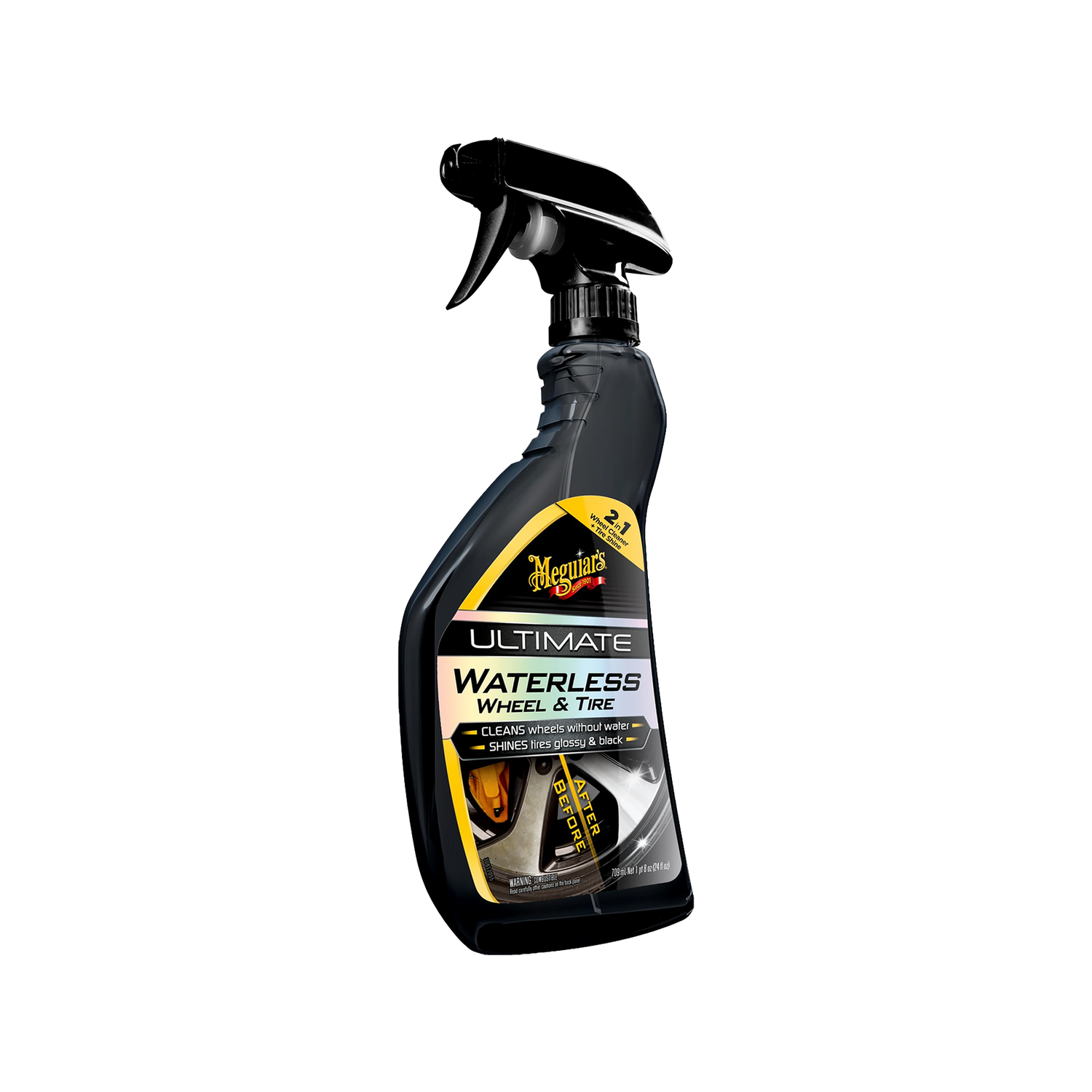 What is Meguiars Ultimate Waterless Wheel and Tire? A waterless 2-in-1 cleaning product that loosens brake dust residue from rims while simultaneously conditioning tires with a deep shine – without water or extensive rinsing.
