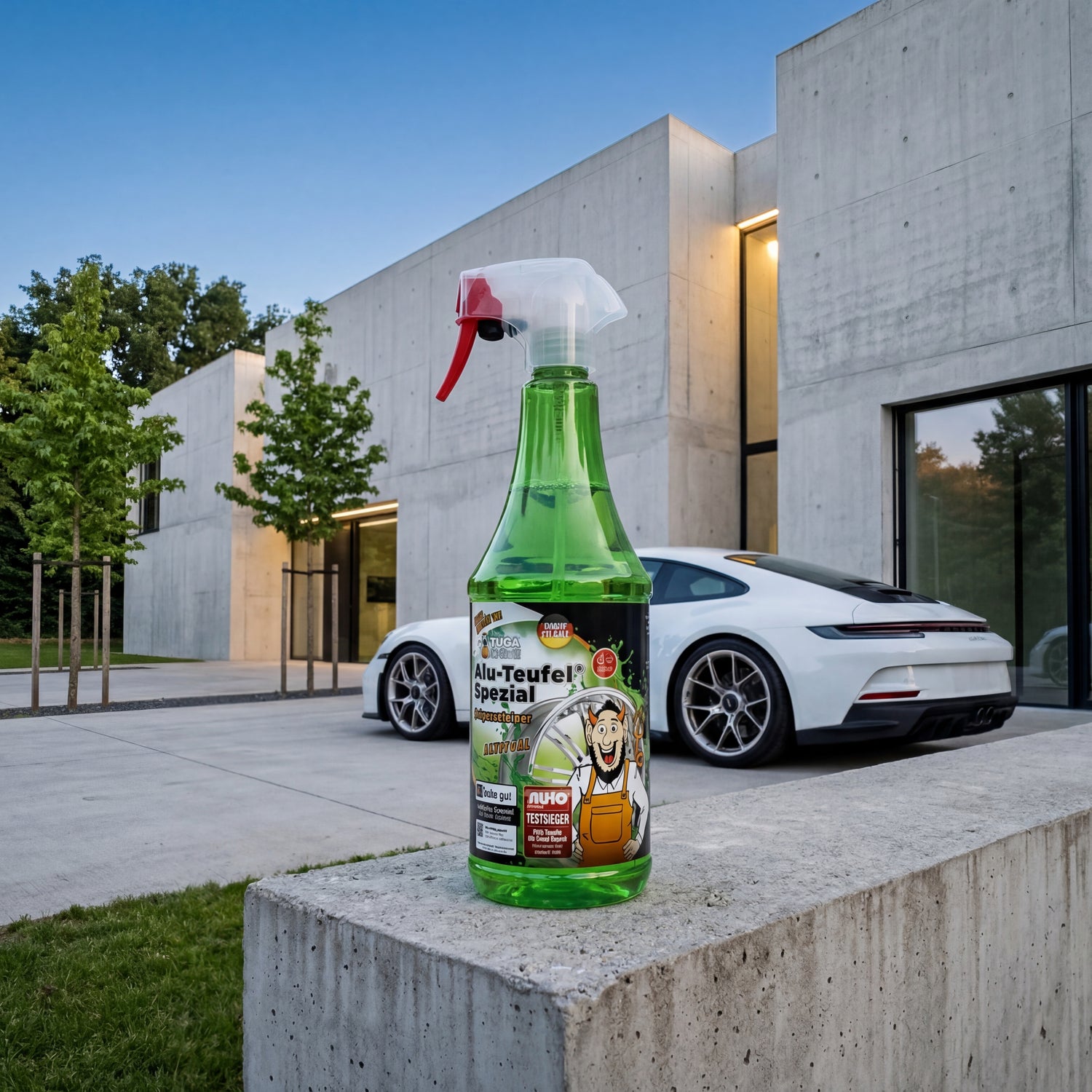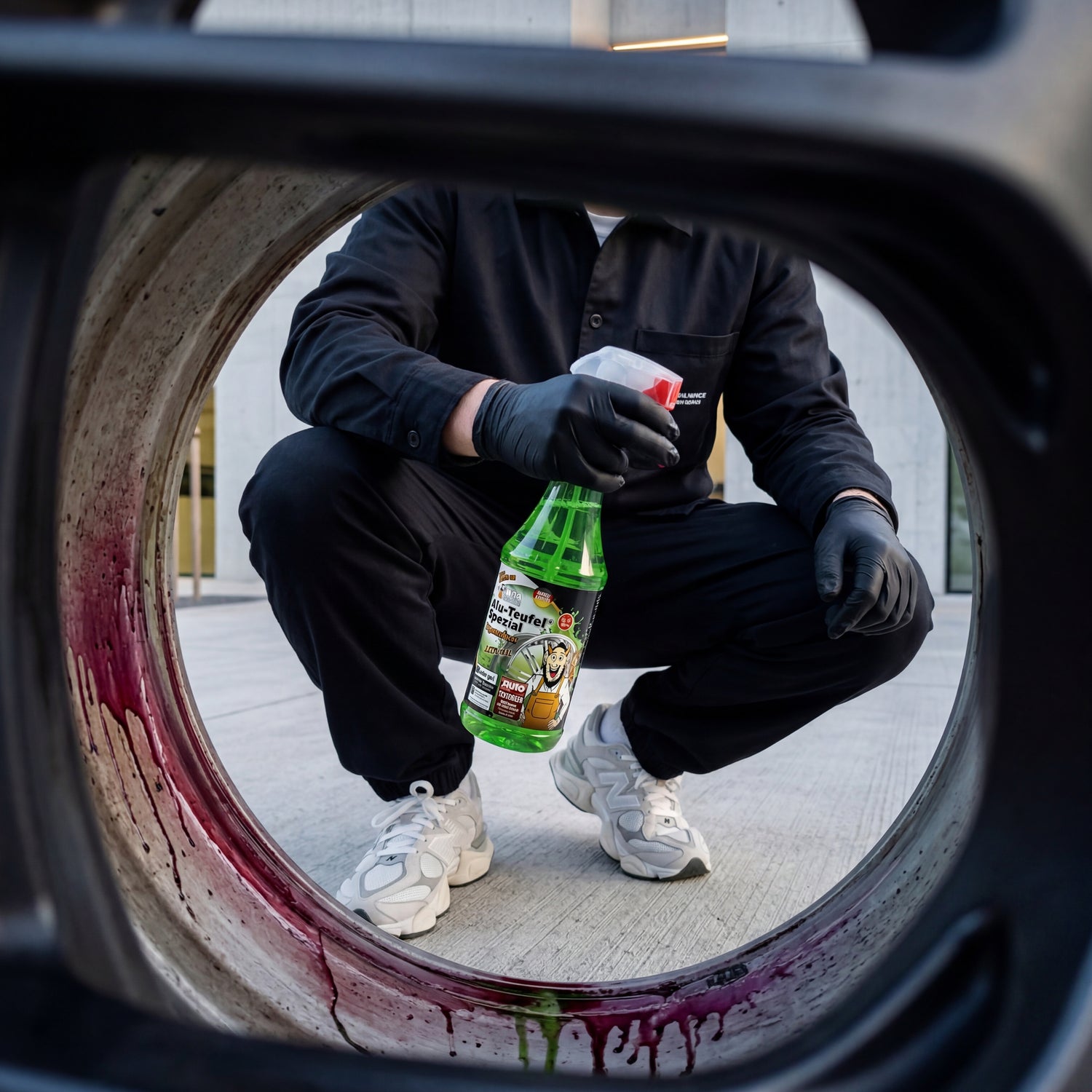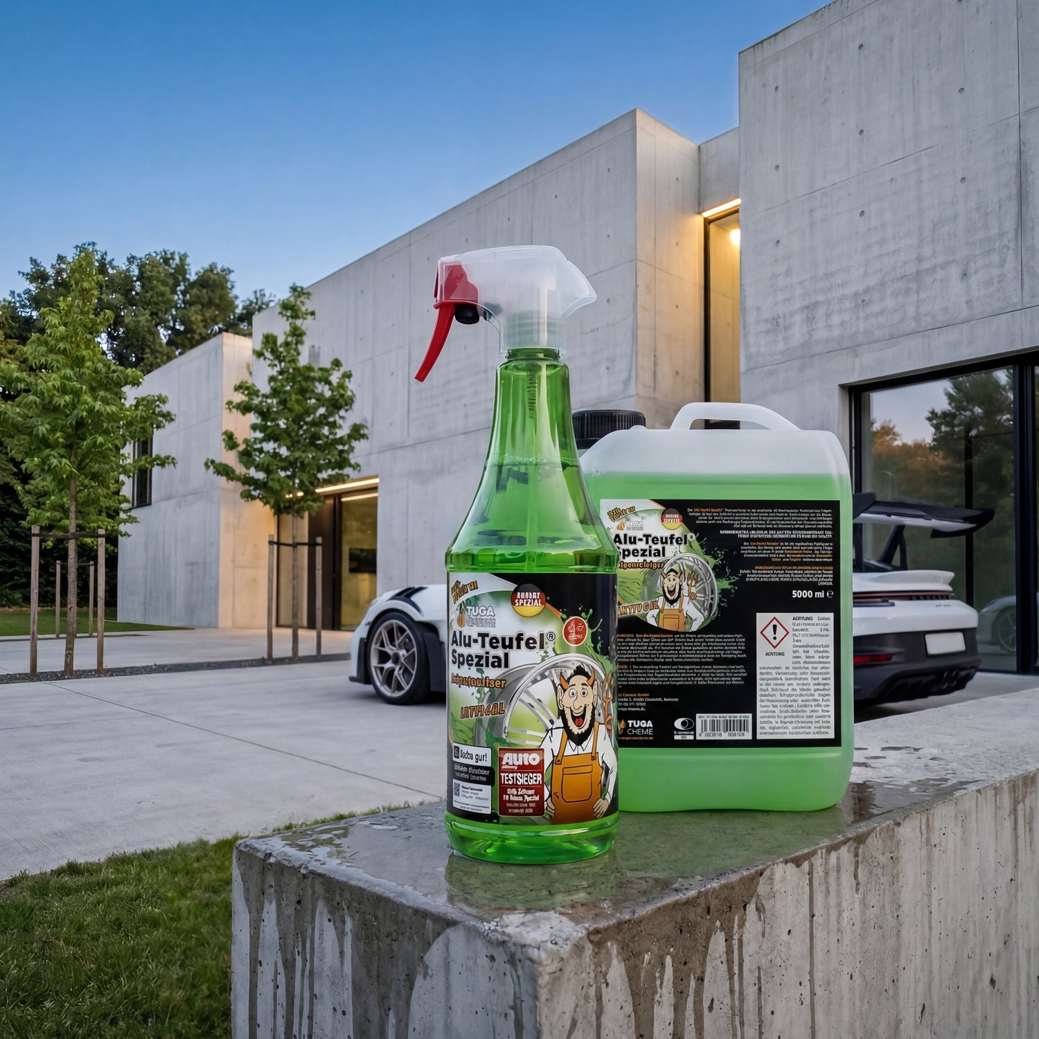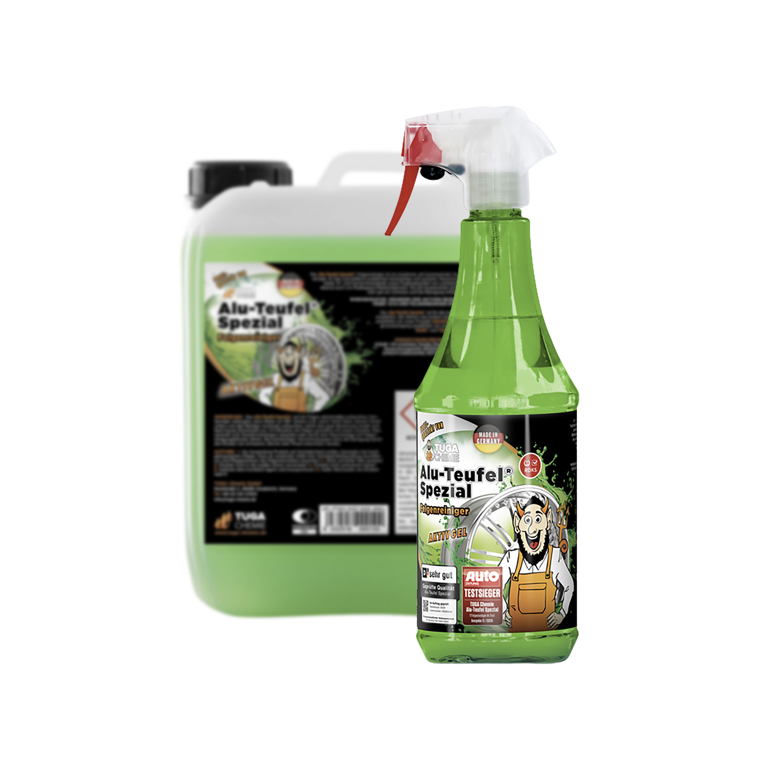 Alu-Teufel Spezial is a rim cleaner gel from TUGA Chemie that works with the active ingredient sodium thioglycolate: The gel binds iron(III) compounds in brake dust and chemically dissolves them from the rim surface — without attacking the rim itself. This is visible by the color change from green to reddish-violet as soon as the gel reacts with iron particles. TUGA Chemie has been producing Alu-Teufel in Osnabrück since the 1970s and has since further developed the formula to today's gel consistency.