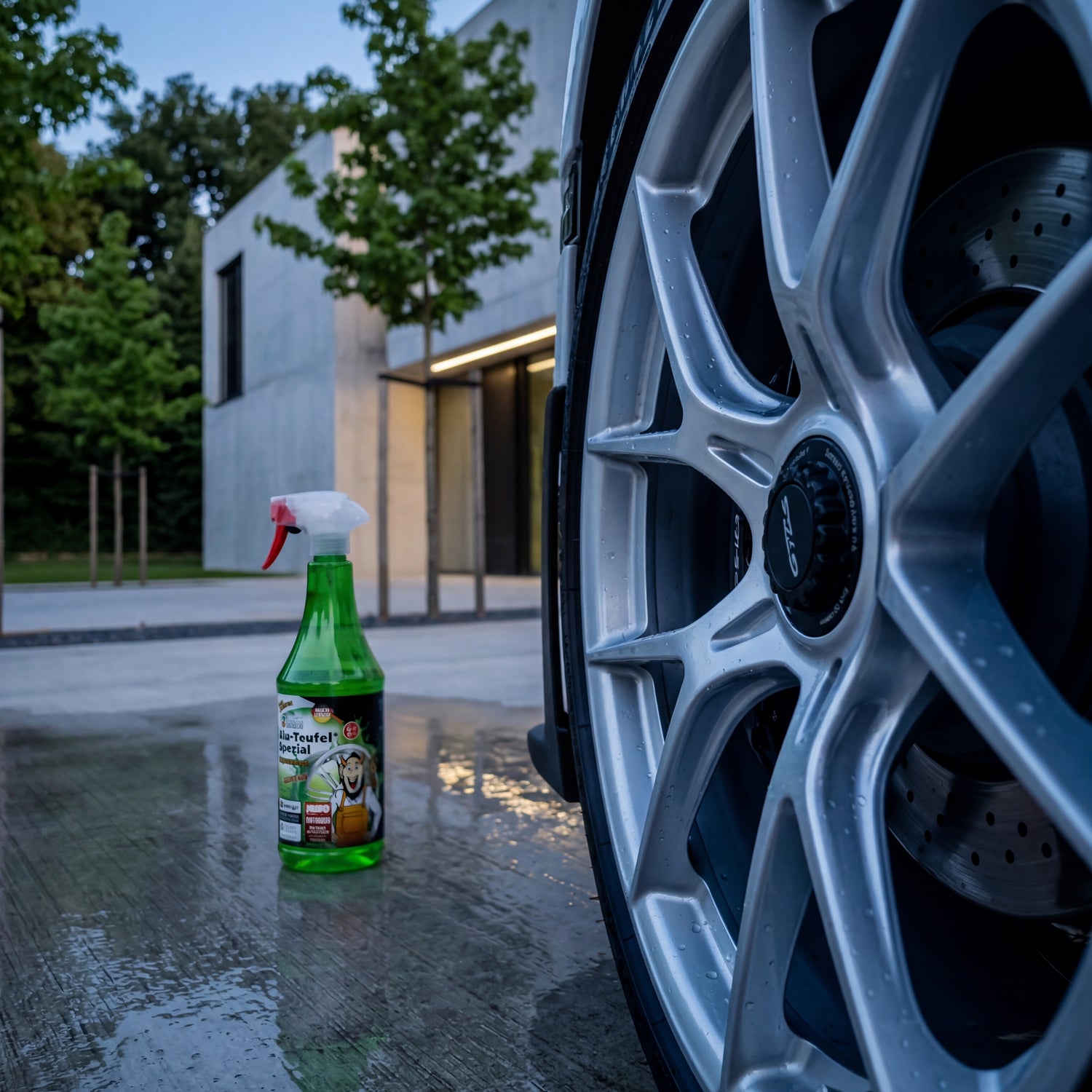 Alu-Teufel Spezial is a pH-skin-neutral wheel cleaner with a gel formula from TUGA Chemie in Osnabrück. The active ingredient, sodium thioglycolate, binds iron(III) compounds in brake dust and chemically detaches them from the rim. The visible color change from green to red-violet indicates in real-time where brake dust is being dissolved. Suitable for all common rim types.