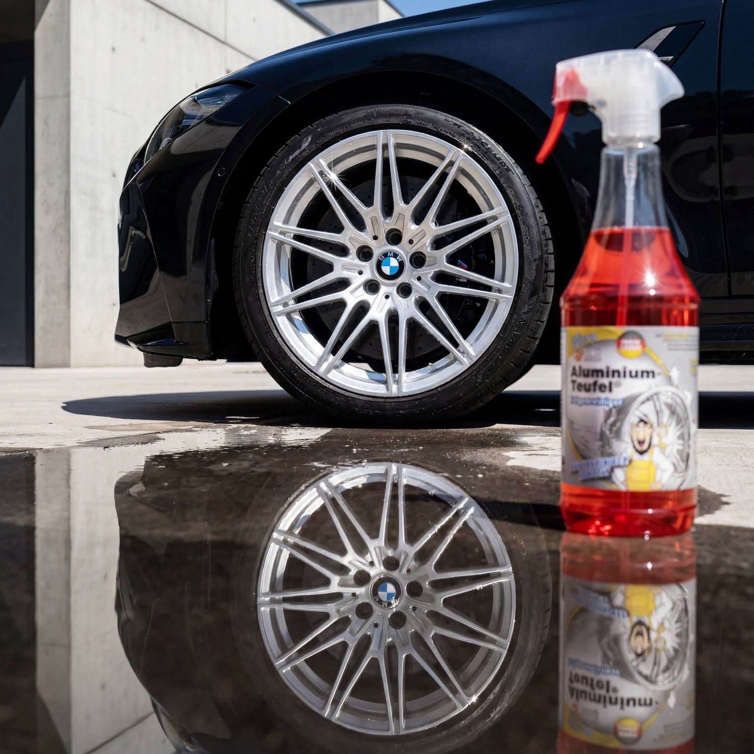 - Acidic formula for what the green Alu-Teufel fails to do. Brake dust that sits on the rim for four weeks or longer oxidizes into stubborn iron(III) compounds that bake into the clear coat. The pH-neutral variant does not reach this depth and only superficially dissolves the residues. The metered phosphoric acid attacks them molecularly and completely dissolves them in one pass.