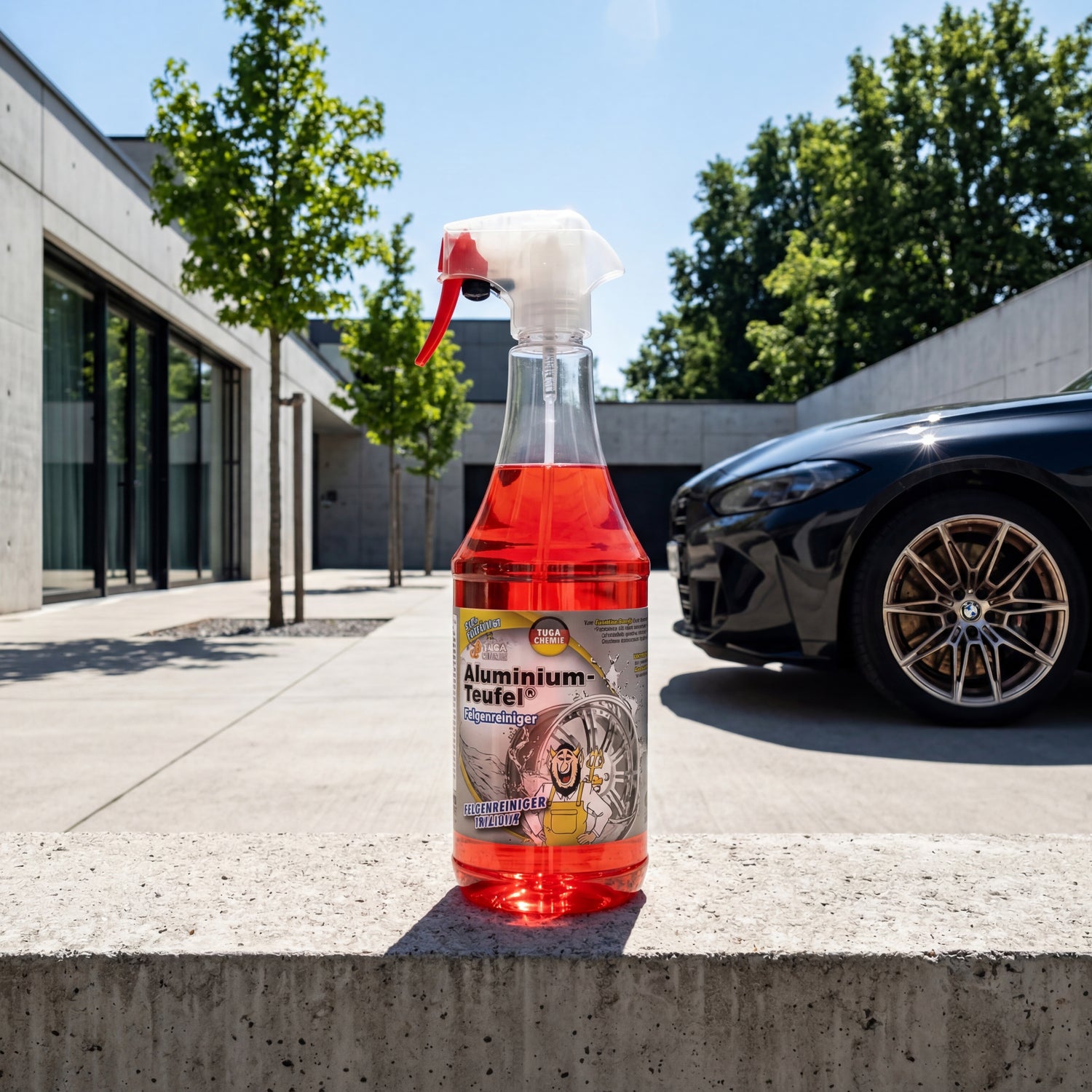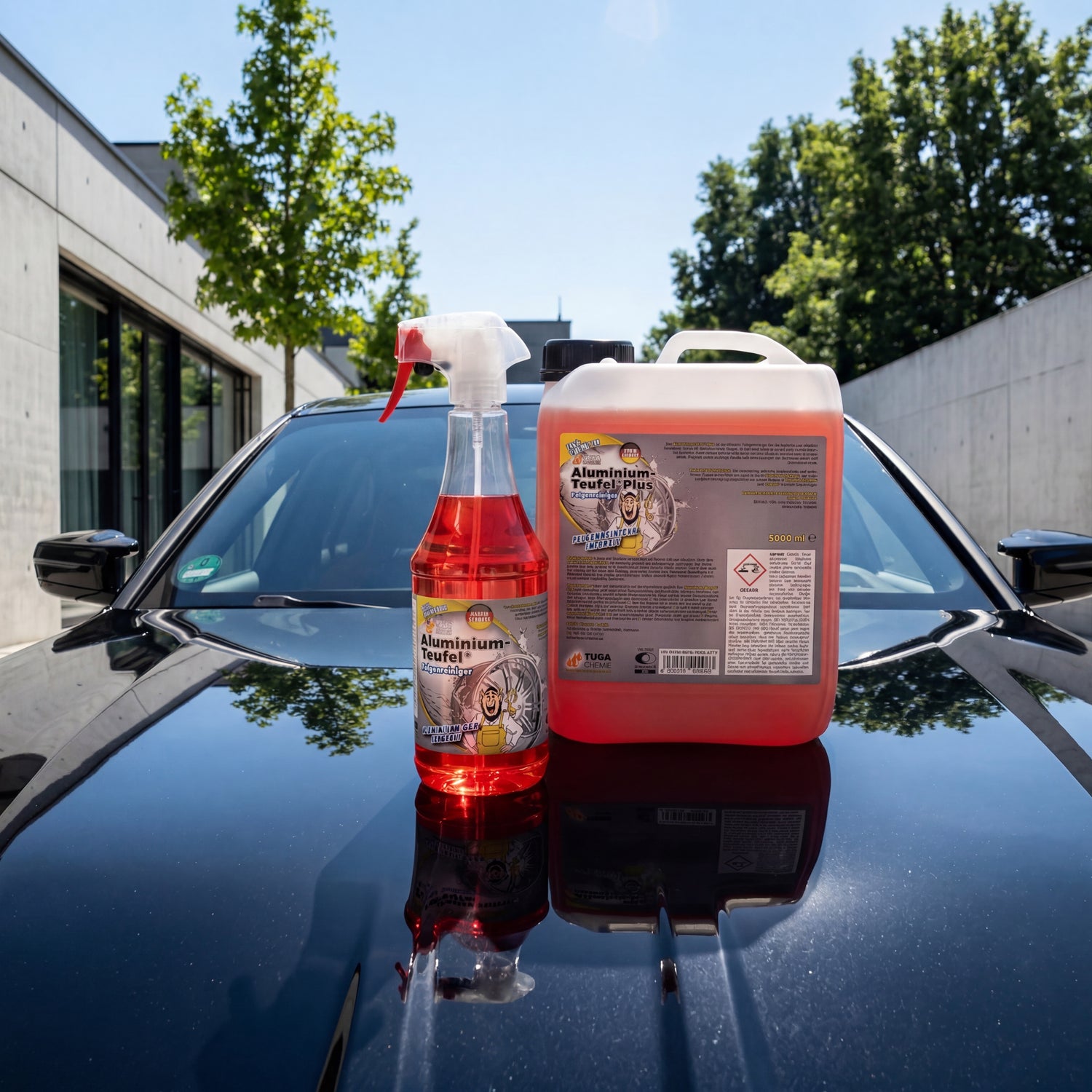 What is Aluminium Devil Red? An acidic wheel cleaner from TUGA Chemie with phosphoric acid and a color change indicator, which chemically dissolves extremely baked-on brake dust, industrial fallout, and mineral limescale deposits on painted aluminum and steel rims. Not suitable for polished, anodized, chrome-plated, or matte rims — the metered acid will leave irreversible etching marks.