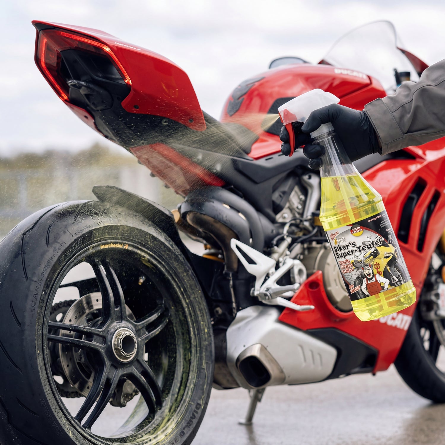 - One cleaner for the entire machine, not an arsenal of special products. Biker's Super-Teufel typically replaces separate wheel cleaner, chain cleaner, and insect remover. This saves space on the workshop shelf, time on the bike, and money on re-purchases. For extreme cases — burnt-on chain spray after 5,000 kilometers or surface rust on the engine block — a special product is still useful, but this one cleaner fully covers 90 percent of normal motorcycle care.