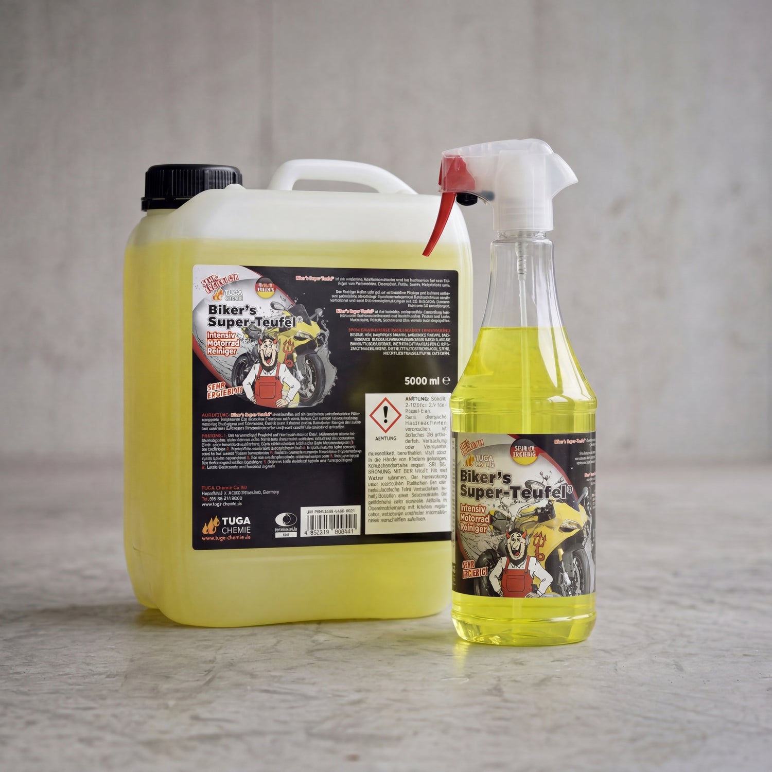 What is Biker's Super-Teufel? An alkaline, acid-free motorcycle cleaner from TUGA Chemie that dissolves chain grease, oil film, brake dust, insect residue, and road grime in one step. One bottle for fairing, frame, rims, engine block, chain set, and exhaust — no five different special cleaners, no multiple dwell times. Not for matte paints without pre-testing, not for open bearings or unprotected electronics, not on hot engine parts.