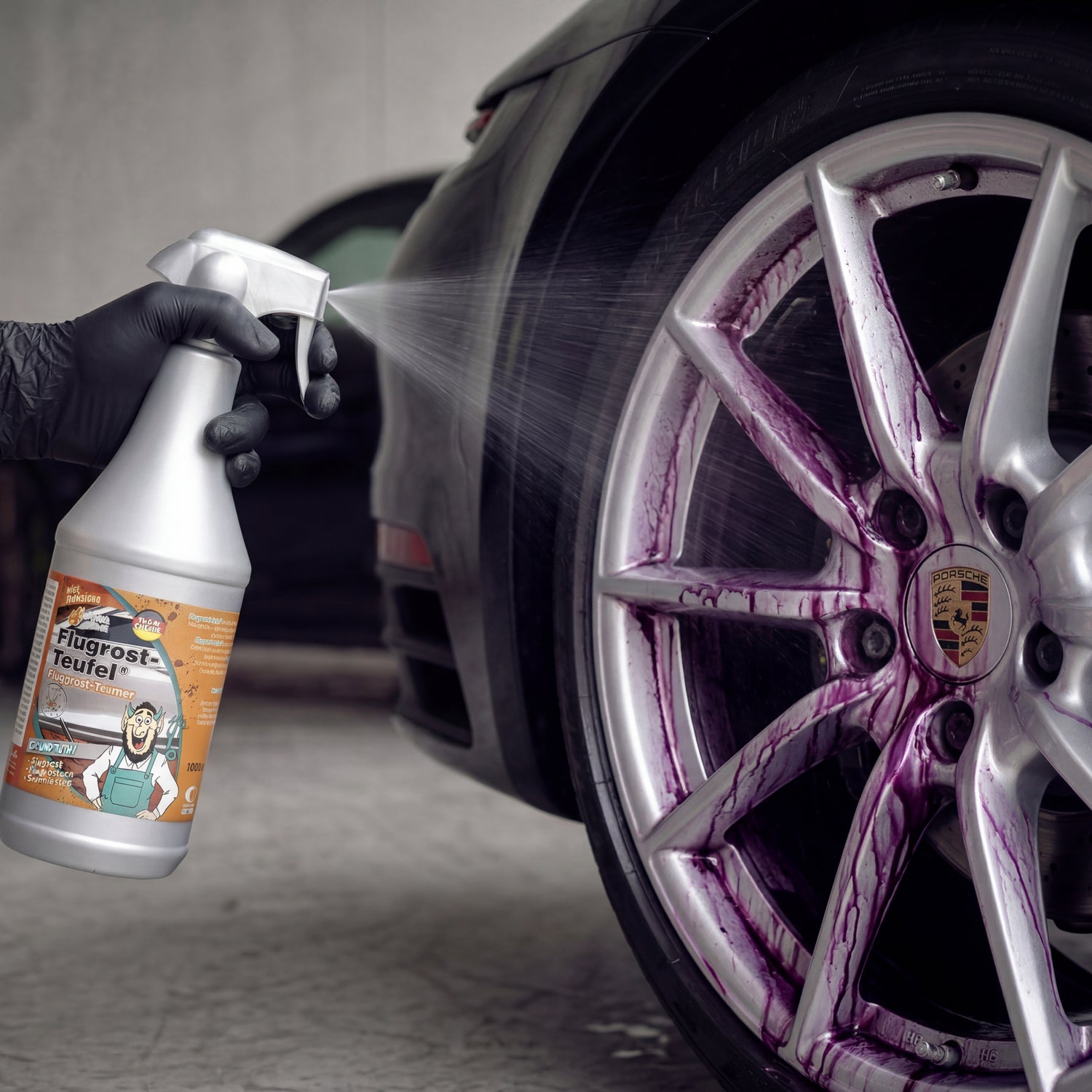 The Rust Stain Devil is an acid-free rust stain remover with color change. It binds iron particles that have settled as rust-brown spots on paint, glass, rims, and plastic, and rinses them away completely with the next jet of water. For us at Detailing1, it is the most honest representative of its class. Anyone who lets it work on a rain-soaked used car in summer will immediately understand why it is part of every thorough detailing.