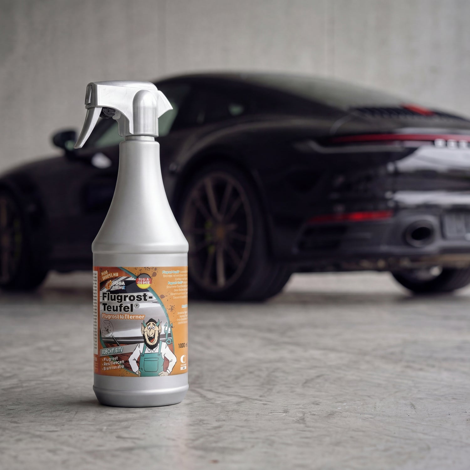 In TUGA Chemie's product range, the Rust Stain Devil complements the Alu-Teufel Spezial and the paint care area. Where the Alu-Teufel specifically works on rims with heavy brake dust, the Rust Stain Devil is the all-rounder for the entire paint plus rims. In our detailing routine, it comes after the pre-wash and before the clay-polish-wax chain. Many customers only discover it when they buy a used car and see these small, unwashable brown spots on the white or silver paint. It is made precisely for this moment. A single pass with a visible color change, and the body looks like it was just picked up again. For regular care, one treatment per year is sufficient, provided you apply paint protection afterwards.