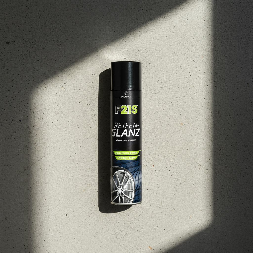 Die Anwendung des P21S Reifen-Glanz ist denkbar einfach und alltagstauglich: Reinige die Reifen zuerst gründlich, am besten mit einem neutralen Shampoo wie dem A1 Speed Shampoo oder einem speziellen Reifen- und Felgenreiniger. Danach müssen die Reifen komplett trocken sein – so haftet der Glanzfilm gleichmäßig. Sprühe das Produkt aus etwa 10–15 cm Abstand auf die Reifenwand auf. Eine gleichmäßige Schicht genügt. Sollte etwas auf die Felge oder Lauffläche gelangen, wische es mit einem weichen Mikrofasertuch ab. Innerhalb weniger Minuten entsteht ein gleichmäßiger, tiefschwarzer Glanz. Für ein perfektes Finish und zusätzlichen Schutz empfiehlt sich die regelmäßige Anwendung nach jeder 2.–3. Wäsche – so bleibt der Pflegefilm stabil und die Oberfläche geschützt. Wichtig: Nicht auf die Reifenlauffläche oder Bremsscheiben sprühen.