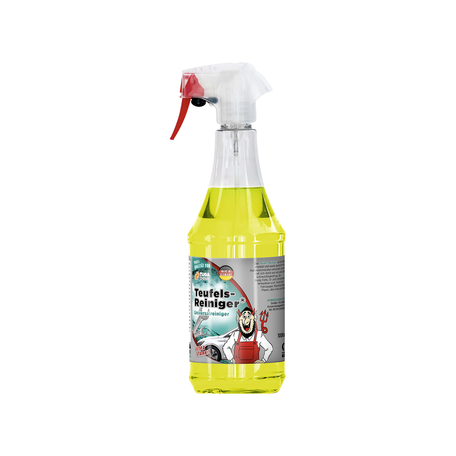 Der Tuga Chemie Teufels-Reiniger® ist ein vielseitiger Universalreiniger, der hartnäckige Verschmutzungen, Fett, Öl und Alltagsschmutz auf zahlreichen Oberflächen zuverlässig löst und sich flexibel im Fahrzeuginnen- und Außenbereich einsetzen lässt.
